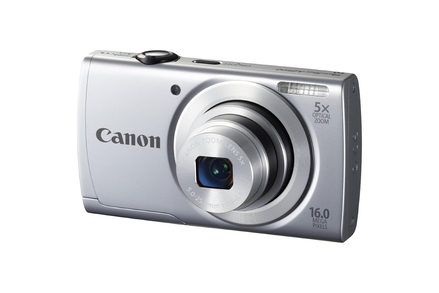 The PowerShot A2500 makes highly advanced imaging technology to capture beautiful stills and video. The camera's 16.0 Megapixel sensor and DIGIC 4 Image Processor capture a wealth of detail and natural color. With the 5x Optical Zoom with 28mm Wide-Angle lens, everything from close-up snaps to breathtaking landscapes is within your reach. Smart AUTO recognizes 32 shooting situations and automatically chooses the proper camera settings, and Digital IS keeps even dark scenes and fast-moving subjects sharp and steady. Preserving memories in rich, lifelike 720p HD video is as easy as pressing the dedicated movie button, and Scene Modes like Fisheye Effect, Toy Camera Effect and Monochrome give you new ways to shoot more creatively. Plus, you can shoot longer with new ECO Mode, which reduces power consumption. A Help Button makes the PowerShot A2500 perfect even for beginners, with one-touch access to helpful instructions and advice.